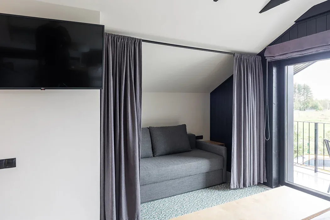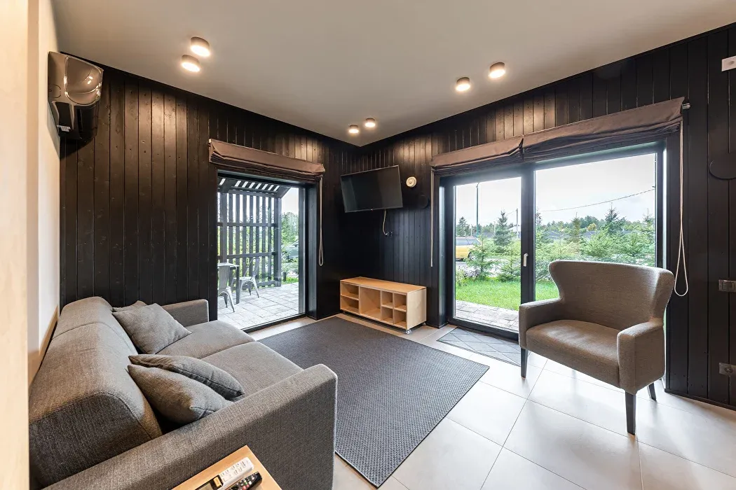 • оснащение дома мебелью (двуспальная кровать, прикроватные тумбочки, диваны, светильники, телевизор)